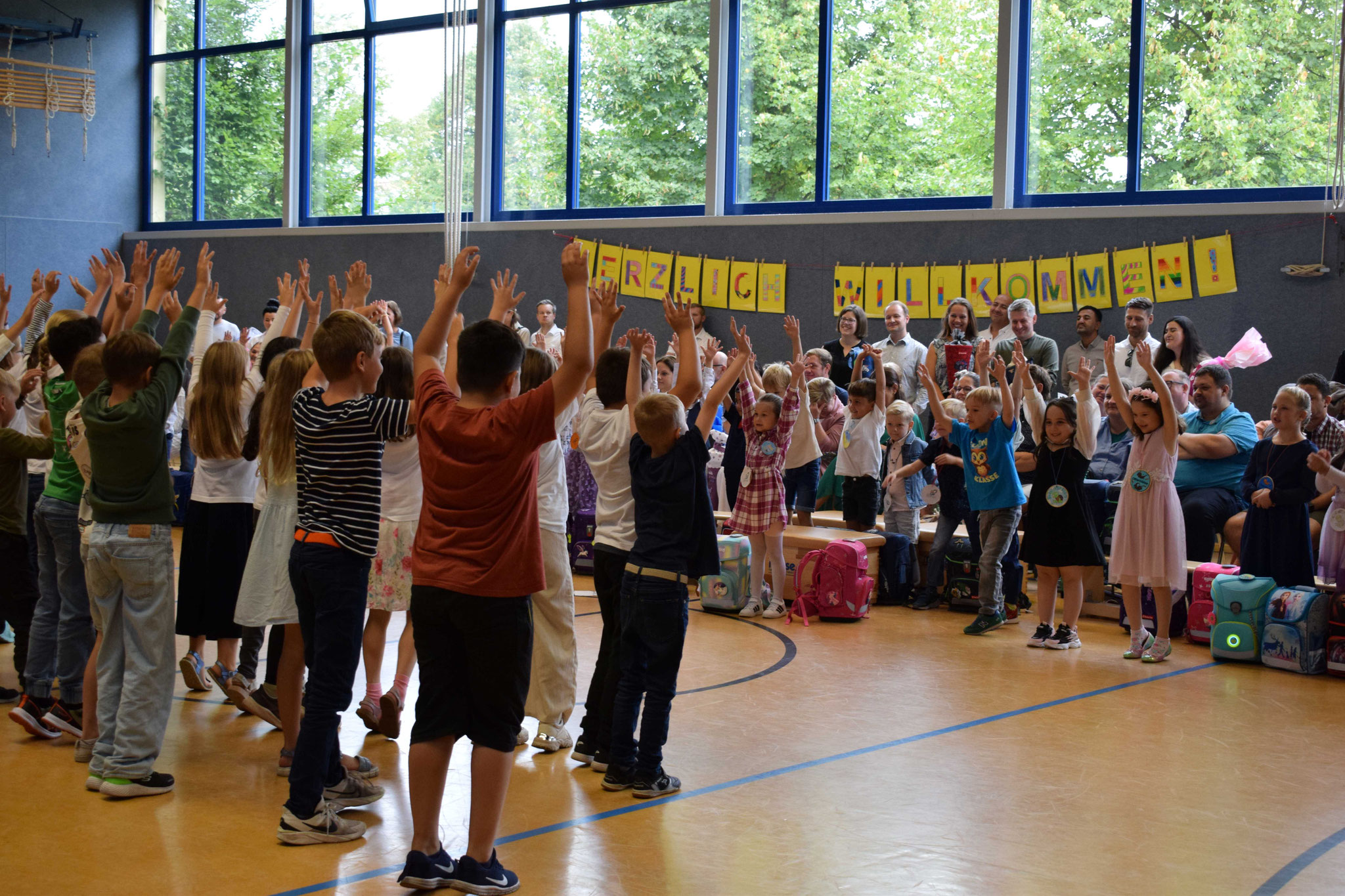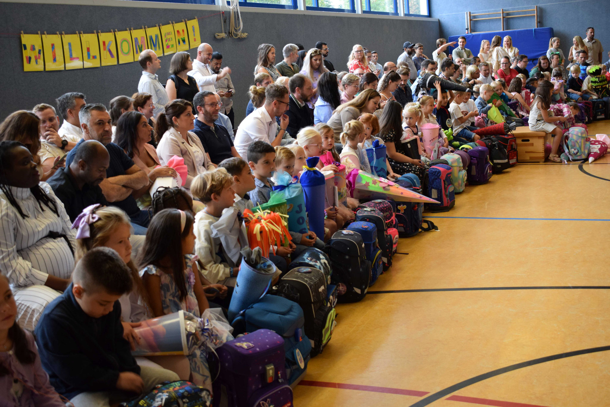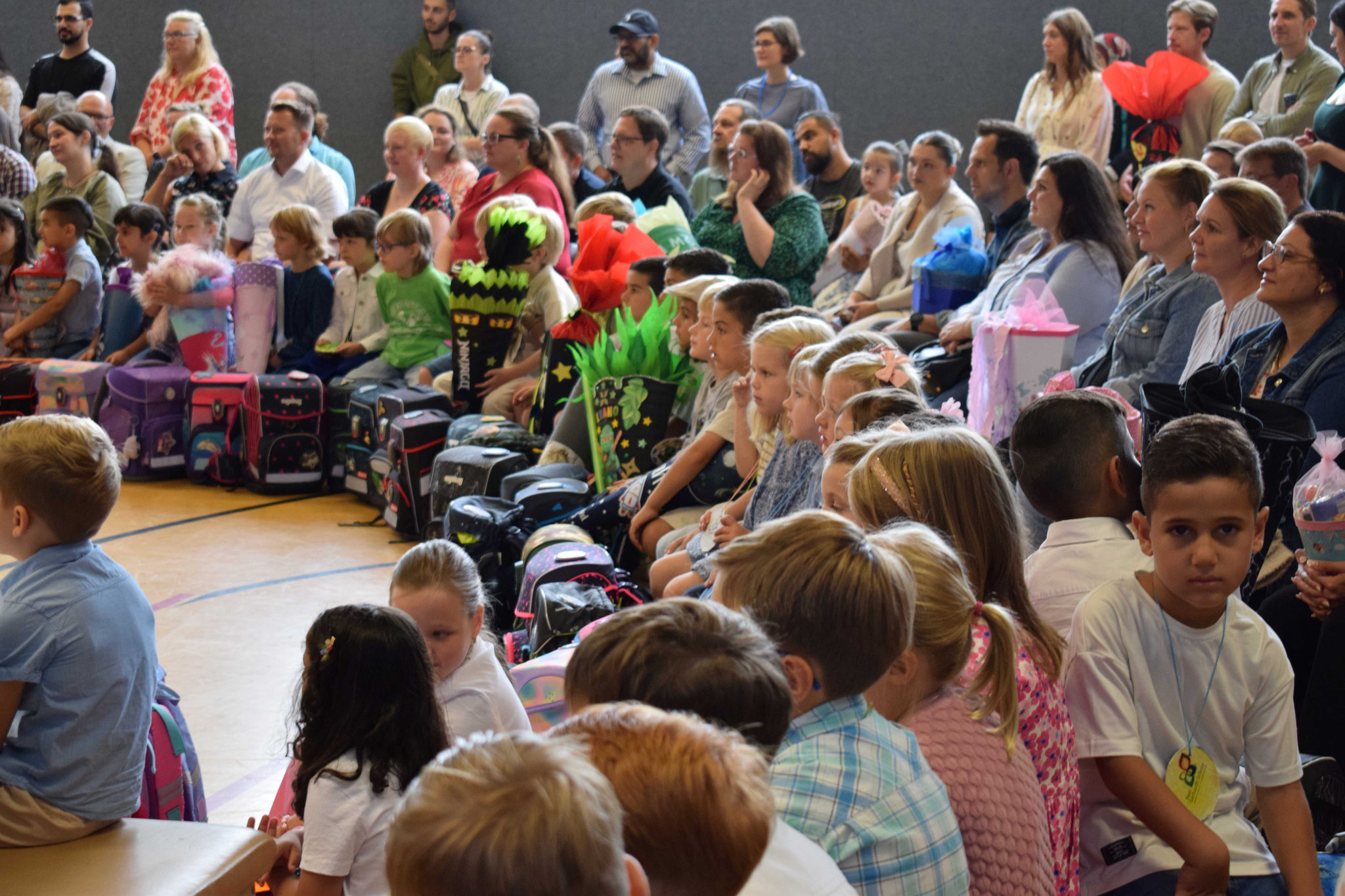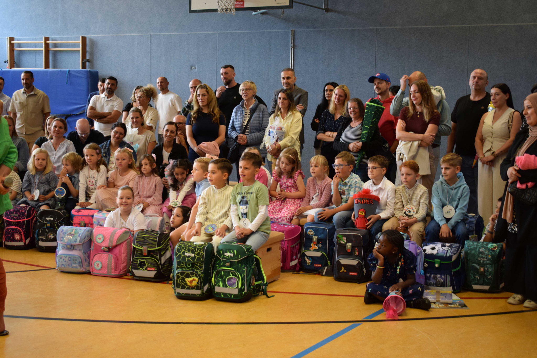 Am Donnerstag, den 28.8.2025 wurden die neuen Erstklässler*innen mit ihren Eltern in unserer Schule herzlich in Empfang genommen. Nach dem ökumenischen Einschulungsgottesdienst am Vorabend wurden sie von der Schulleiterin Frau Rasche im Rahmen einer bunten Feier in der Sporthalle begrüßt.