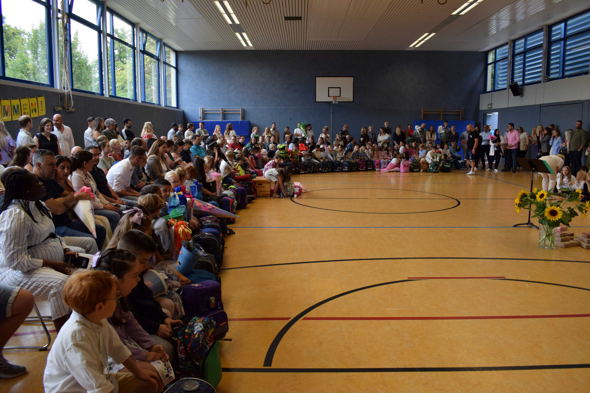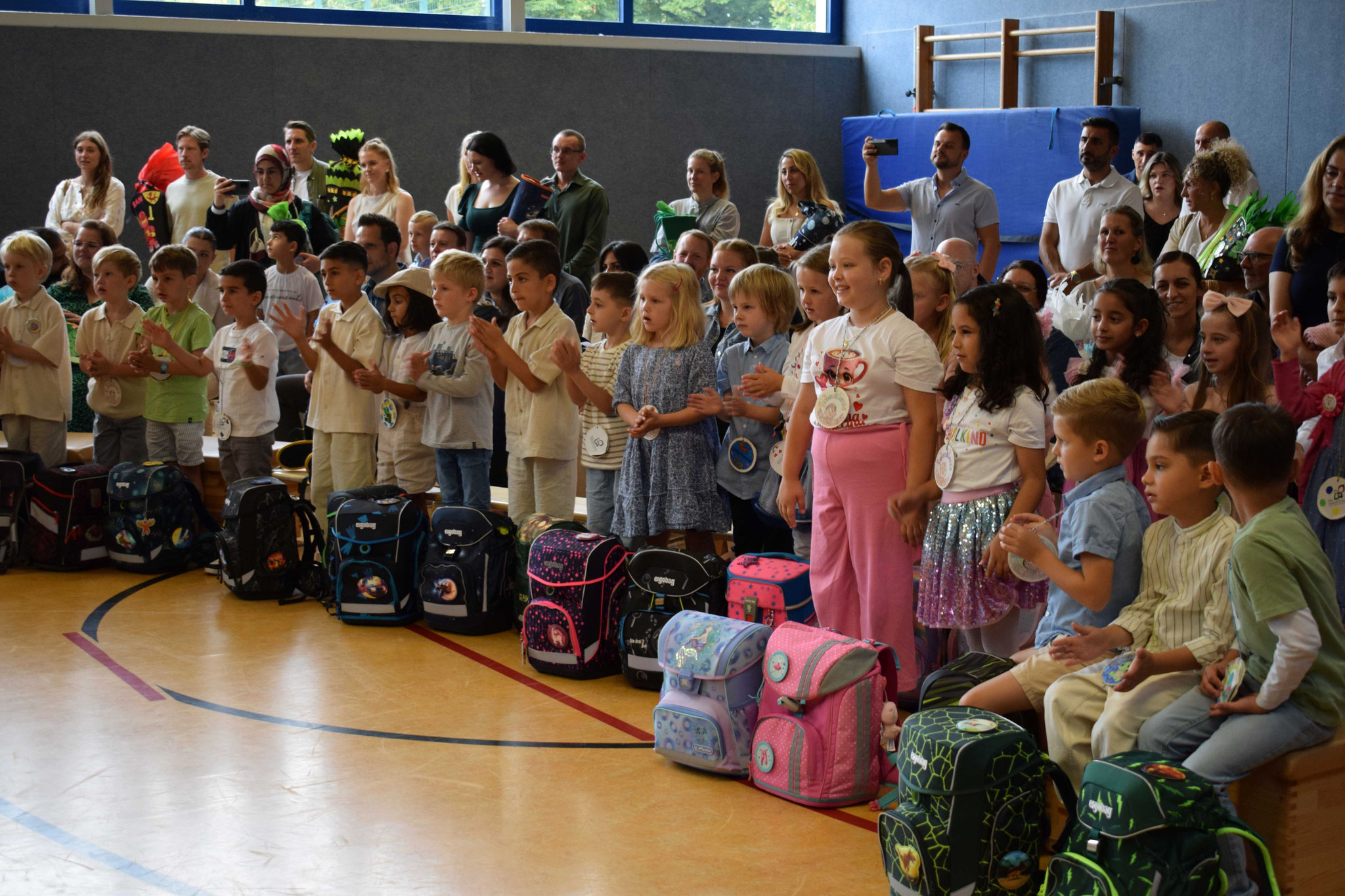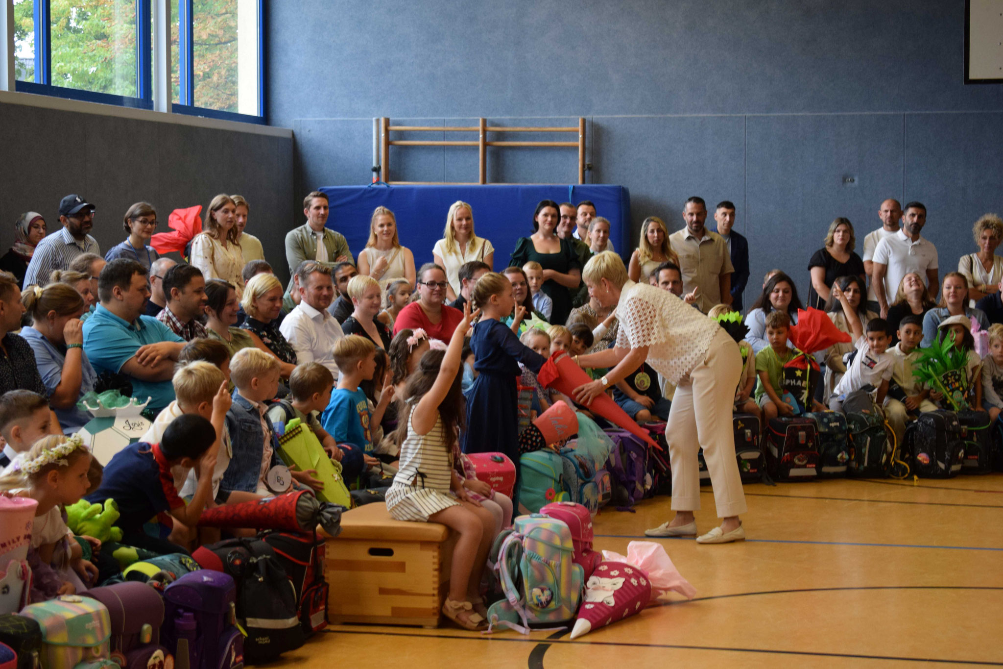 Am Donnerstag, den 28.8.2025 wurden die neuen Erstklässler*innen mit ihren Eltern in unserer Schule herzlich in Empfang genommen. Nach dem ökumenischen Einschulungsgottesdienst am Vorabend wurden sie von der Schulleiterin Frau Rasche im Rahmen einer bunten Feier in der Sporthalle begrüßt.