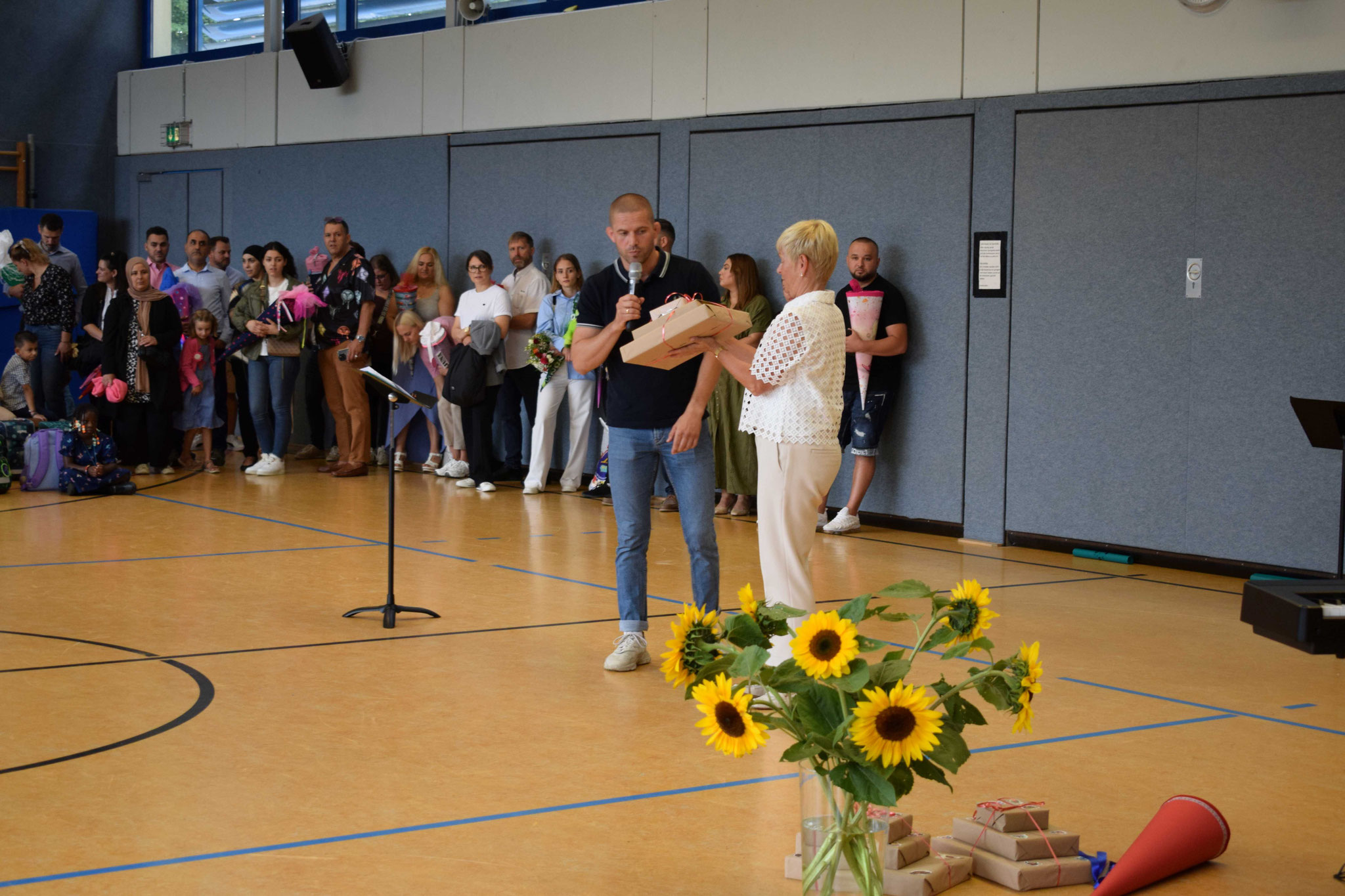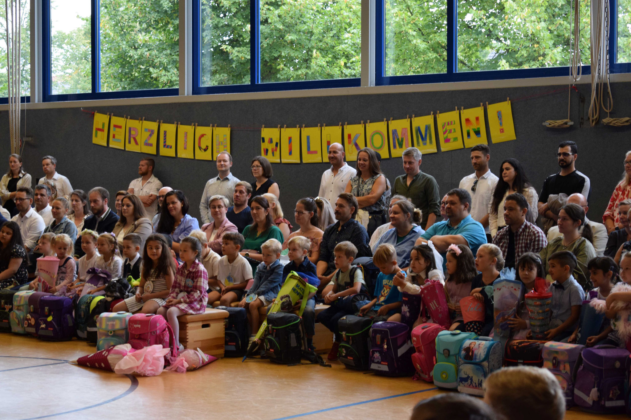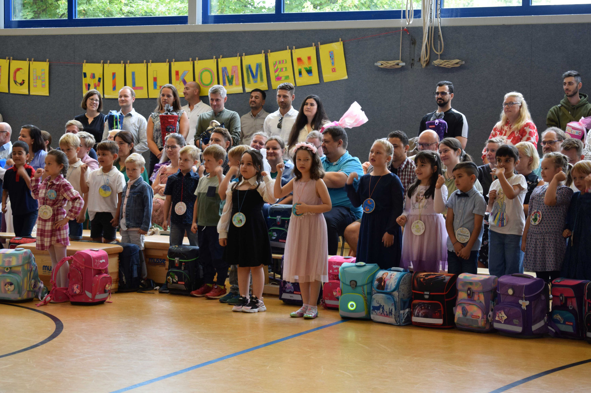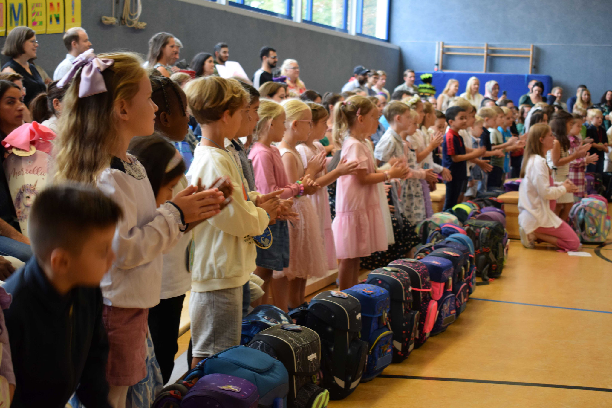Am Donnerstag, den 28.8.2025 wurden die neuen Erstklässler*innen mit ihren Eltern in unserer Schule herzlich in Empfang genommen. Nach dem ökumenischen Einschulungsgottesdienst am Vorabend wurden sie von der Schulleiterin Frau Rasche im Rahmen einer bunten Feier in der Sporthalle begrüßt.