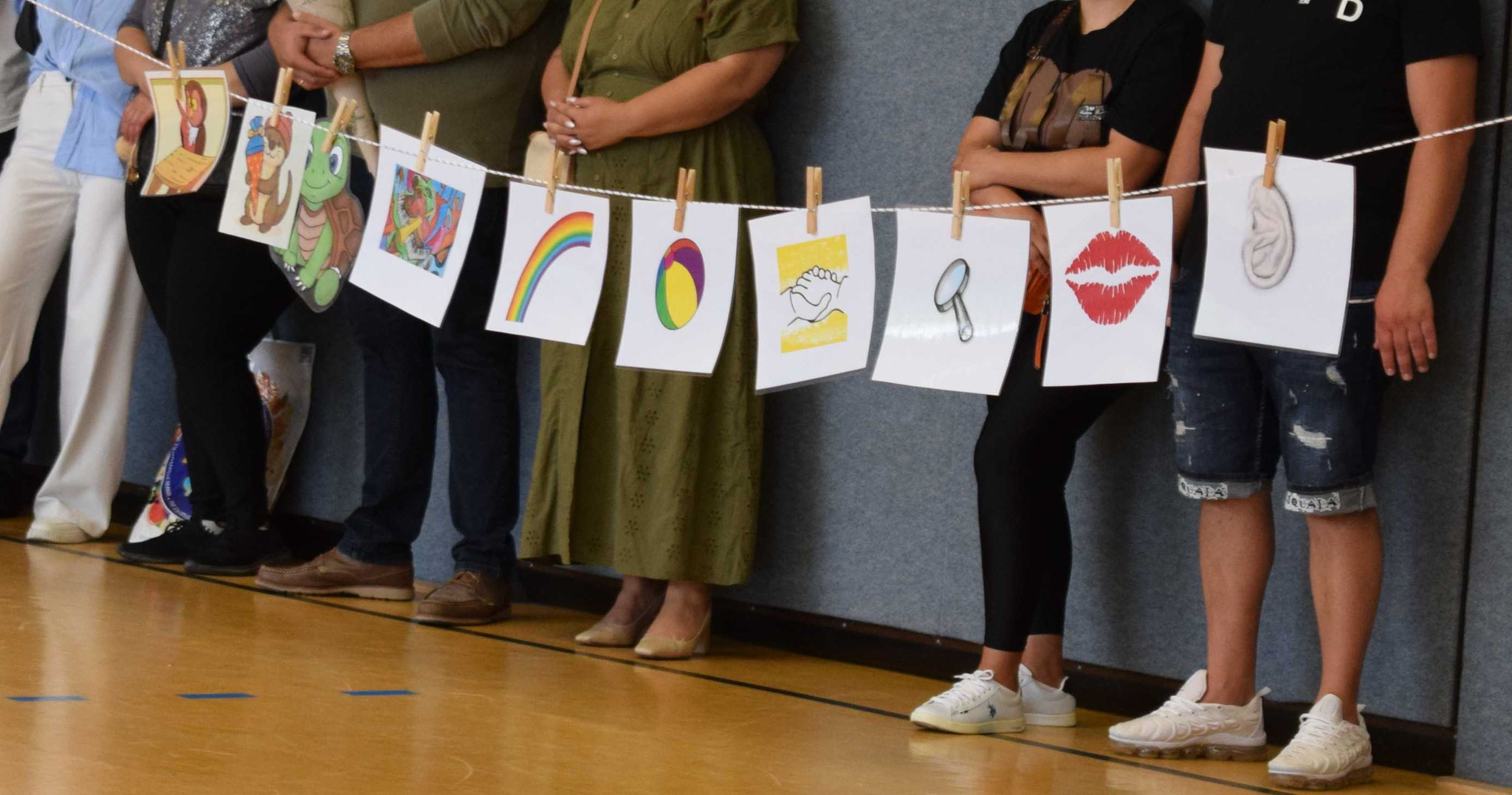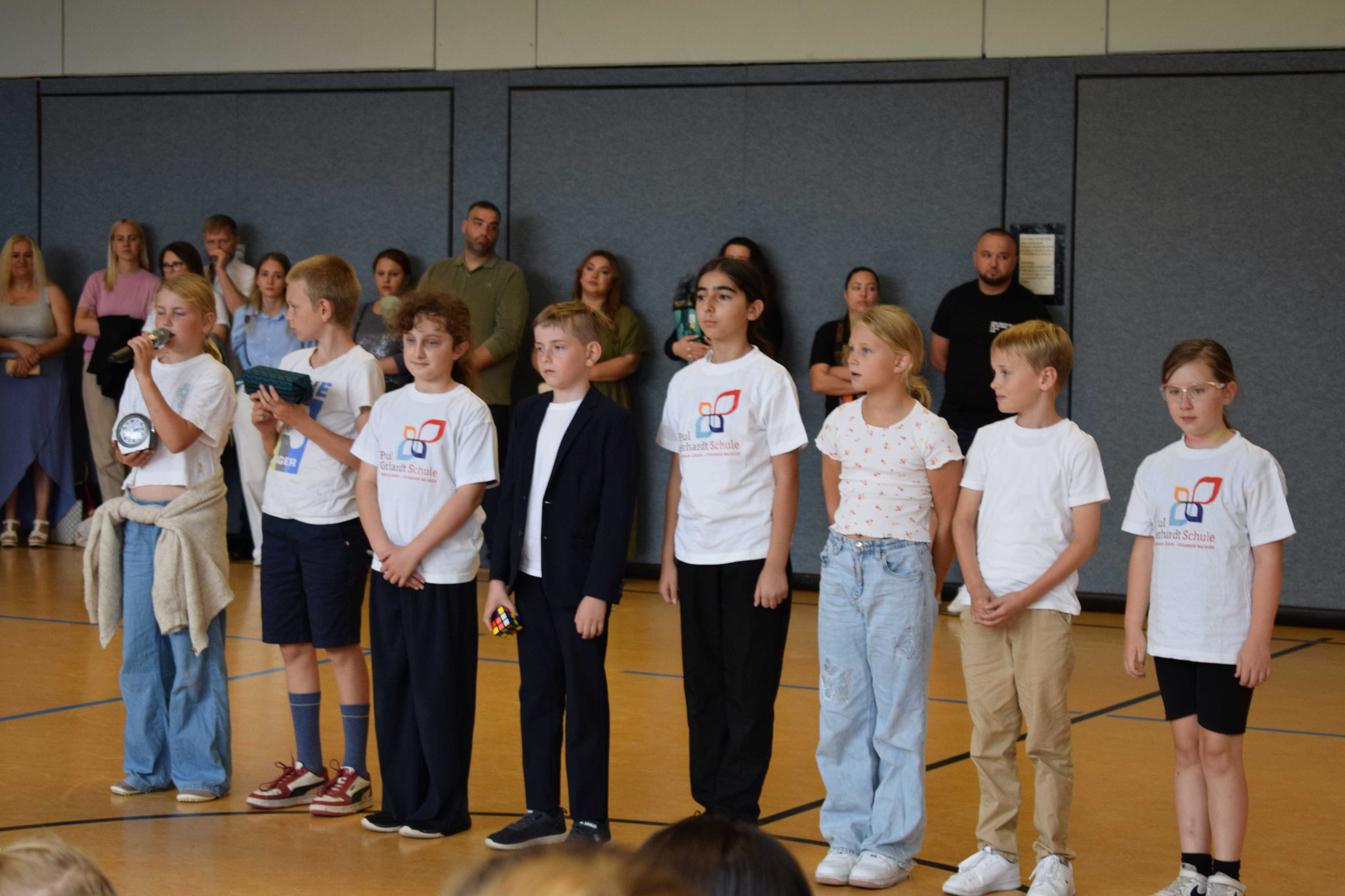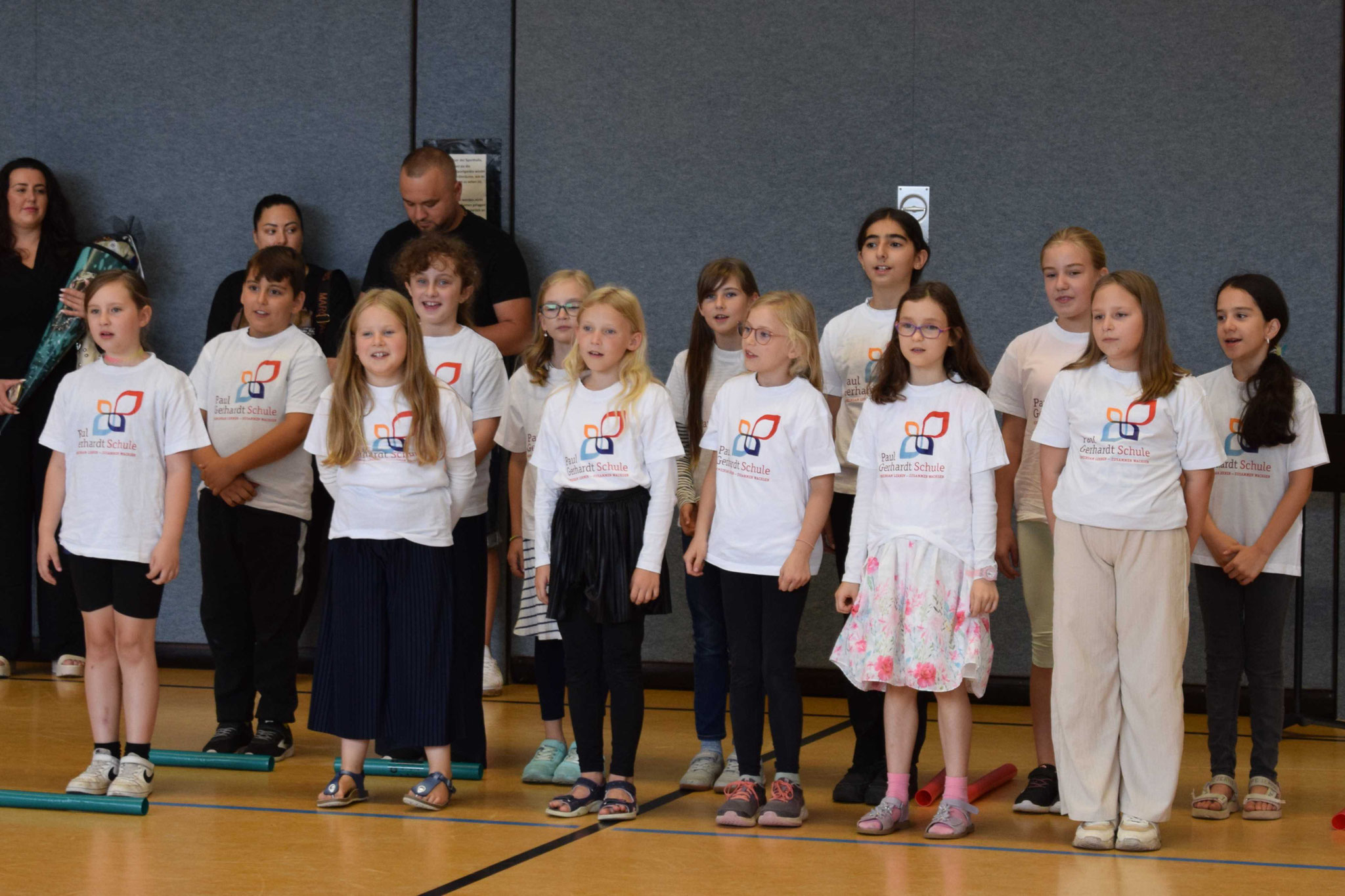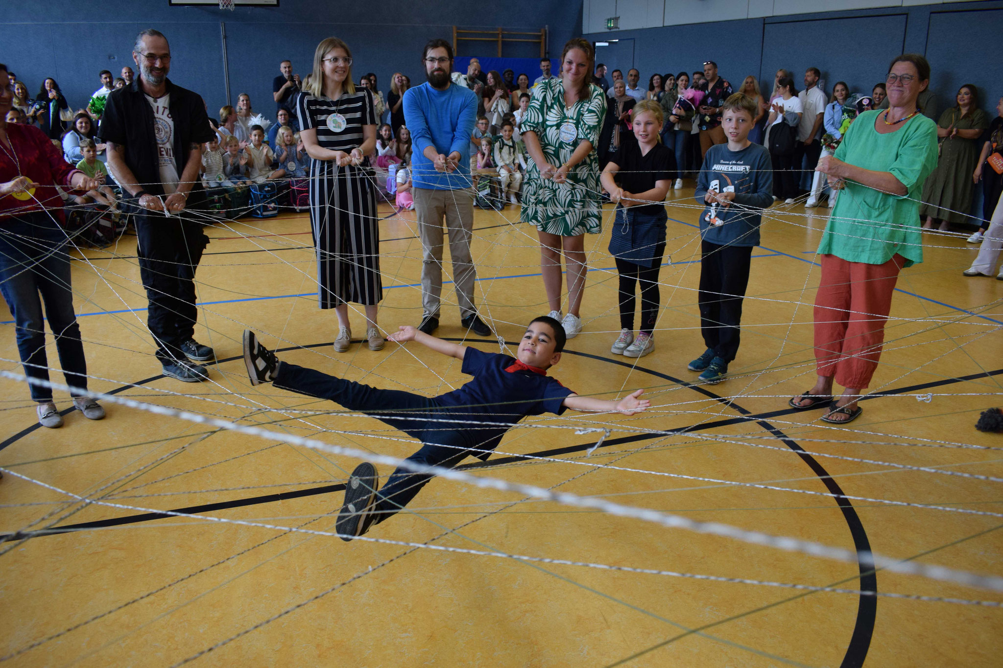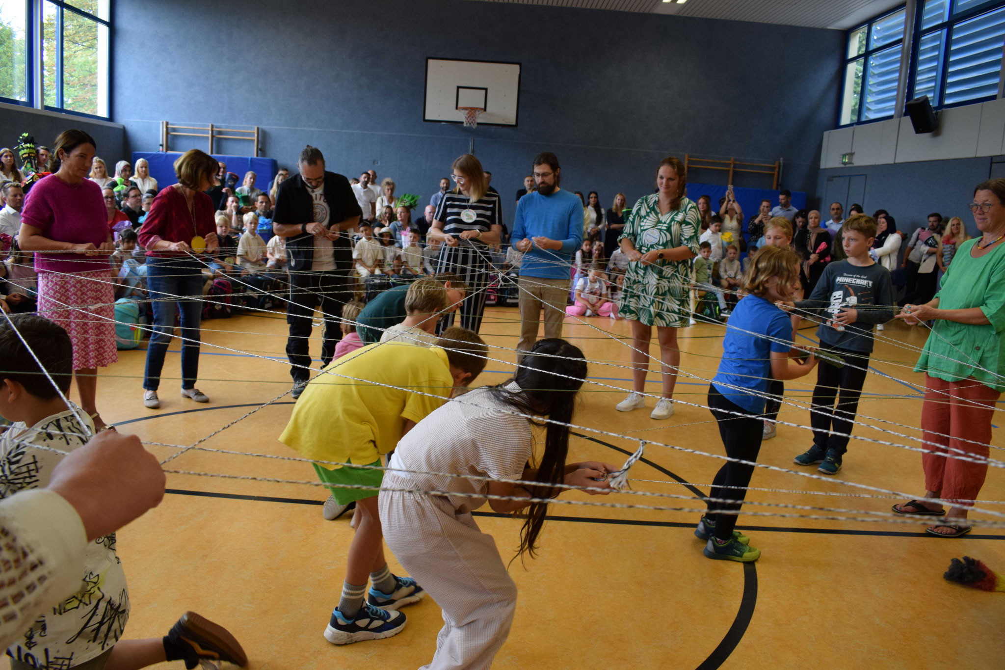 Die Paten aus dem vierten Schuljahr und die Paul-Gerhardt-Nachtigallen begrüßten die Erstklässler*innen mit schwungvollen Liedern und einem Gedicht. Auch ein Spinnennetz mit Mitgliedern der gesamten Schulgemeinde wurde von Kindern der Klasse 4b geknüpft. Alle neuen Erstklässler*innen sollen sich von allen an der Schule Beteiligten getragen und umsorgt fühlen. Ein mutiger Schulanfänger probierte das gespannte Netz gleich aus und wurde mit großem Applaus belohnt. Herr Lakämper vom Förderverein überreichte Überraschungsgeschenke an die neuen Klassenleitungen. Anschließend durften die neuen Schulkinder mit ihren Klassenleitungen, Frau Pietler, Frau Püth und Frau Sewald in ihre neuen Klassenräume gehen und eine erste Unterrichtsstunde erleben.